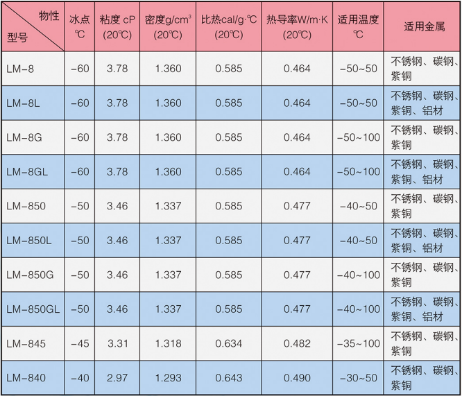 LM-8系列冰河冷媒由改性有機酸鹽構成,主要添加劑包括防腐蝕劑,防霉劑,增溶劑,穩定劑等。外觀(guān)為淺色液體,沸點(diǎn)高于105℃,不易揮發(fā),無(wú)閃點(diǎn),不可燃,低毒。